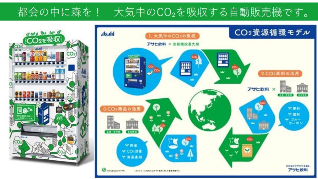 この自動販売機にはCO₂吸収材が内蔵されていて、まるで木のように周囲の空気からCO₂を吸い込んでくれます。都会の中に小さな木を植えて、少しずつ森をつくっていくような、そんな取り組みと考えています。身近な自販機を、このエコな自販機に替えるだけで、そんな活動に参加できます。ぜひ一緒に未来の環境づくりにチャレンジしてみませんか。 資料をダウンロード