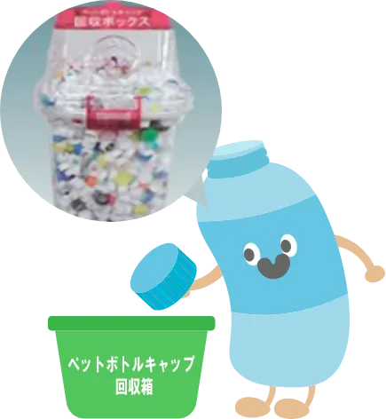 ペットボトルのキャップを回収し、再資源化を促進しCO2排出量を抑え、そしてそのキャップの売却利益で世界の子どもたちにワクチンを届ける「エコキャップ運動」に参加しています。回収したペットボトルキャップ約430個で、ポリオワクチン1人分の寄付をすることができ、世界(ミャンマーやラオス等)の子どもたちに寄付しています。